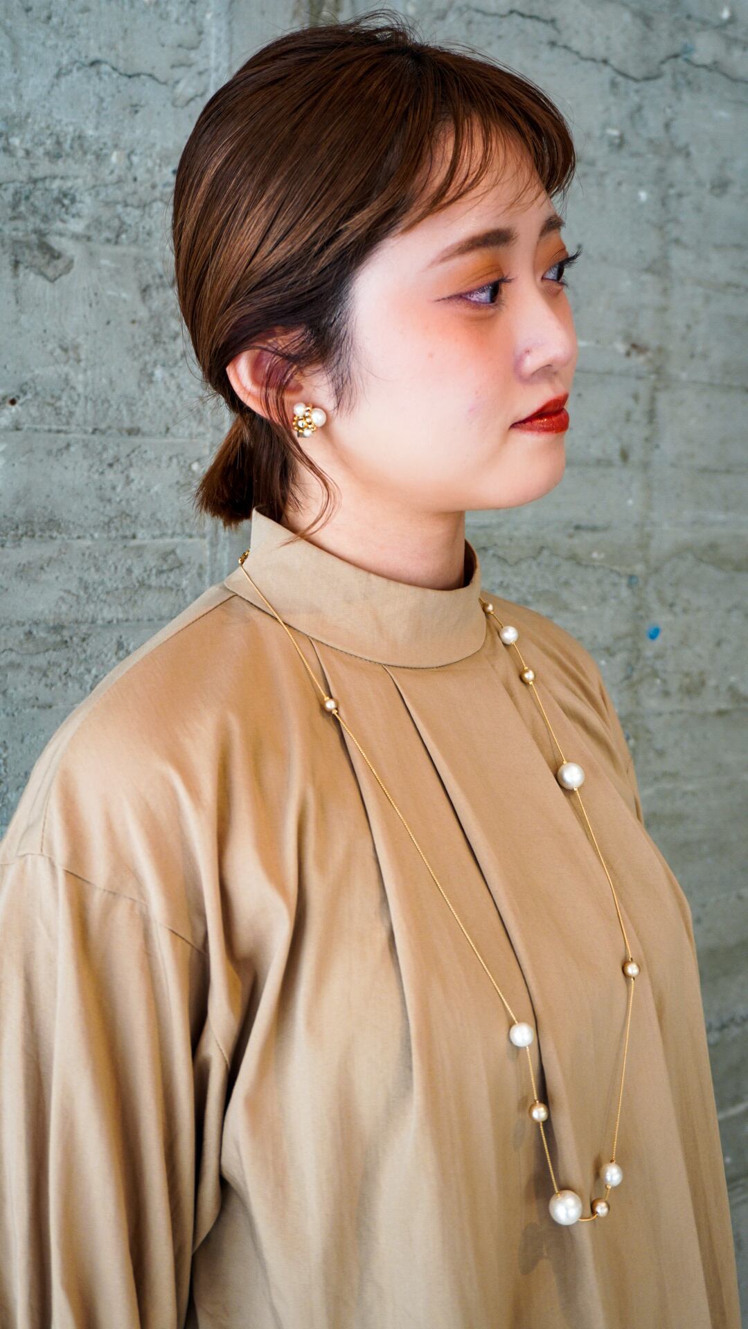 コットンパールは、その軽さとふんわりとした質感が特徴で、身につけると心地良い優れたアイテムです。ロングネックレスとしての基本デザインに加え、アシンメトリーなディテールが個性的な印象を演出。シンプルながらも存在感があり、女性らしさを引き立てます。