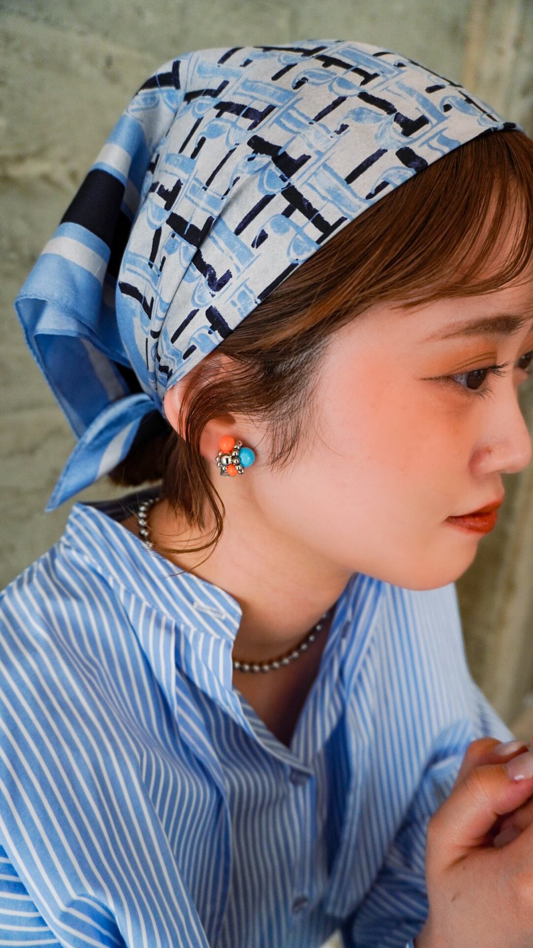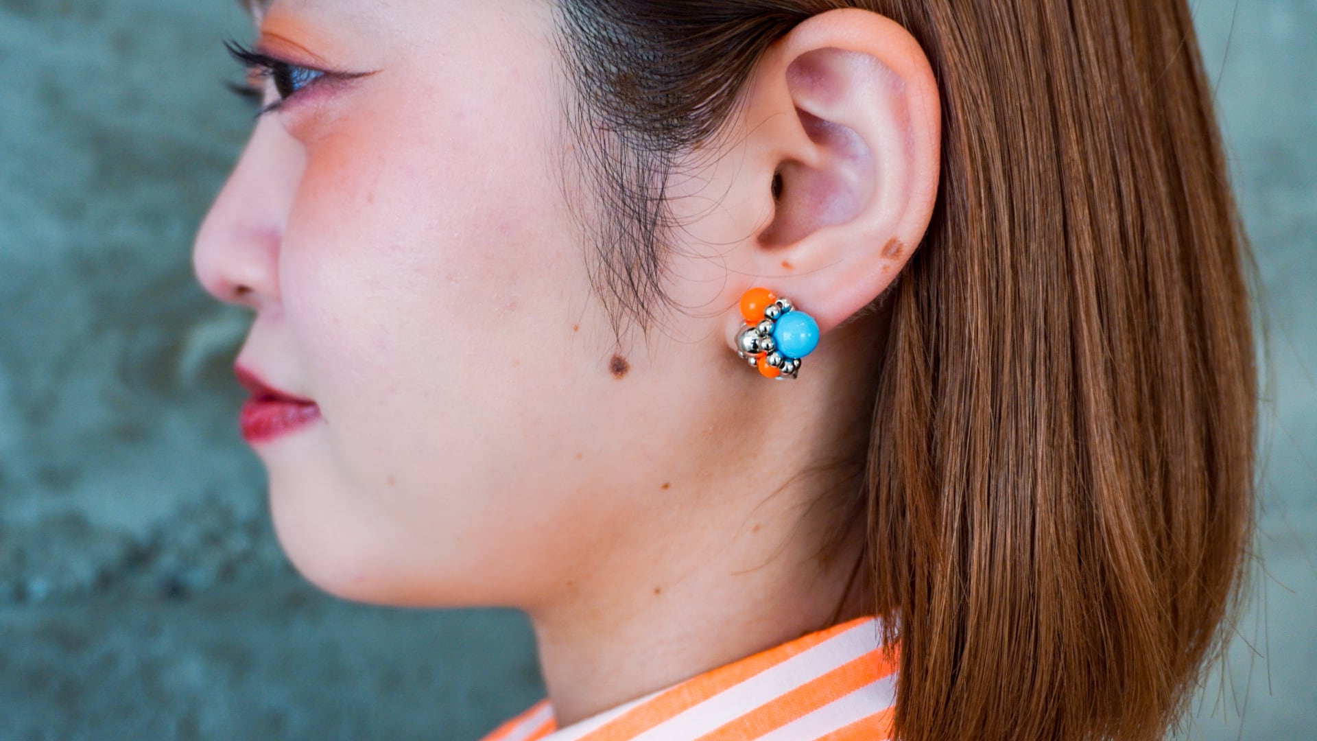 このピアスは、色とりどりの丸玉が連なったデザインが特徴です。見る人を惹きつける鮮やかなカラーは、どんなコーディネートにも映え、一層華やかな印象を与えます。軽やかなつけ心地で、デイリーなおしゃれにも最適です。